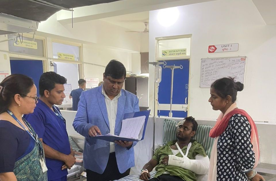 चंदवाजी के निम्स अस्पताल में घायलों की कुशलक्षेम पूछते निदेशक डॉक्टर अनुराग तोमर। |